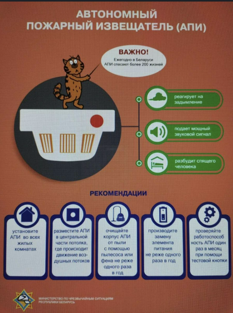 Помните: с точки зрения пожарной безопасности, установленные в жилых помещениях АПИ, должны содержаться в работоспособном и исправном состоянии. Берегите себя и своих близких! В случае возникновения чрезвычайной ситуации звоните по номеру «101» или «112».