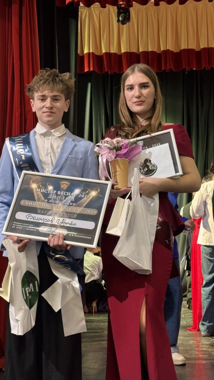 Учащиеся 10 «А» класса «Юный прокурор» Белоусов Артем и Бакеренкова Мария представили нашу школу на районном этапе городского конкурса «Мисс и Мистер Весна-2026». Среди 14 талантливых участников в творческих номерах, дефиле, ораторском мастерстве и представлении обладателями титулов нашей школы стал  Белоусов Артем I-Вице-Мистер Весна-2026.Пожелаем победителю дальнейших успехов.