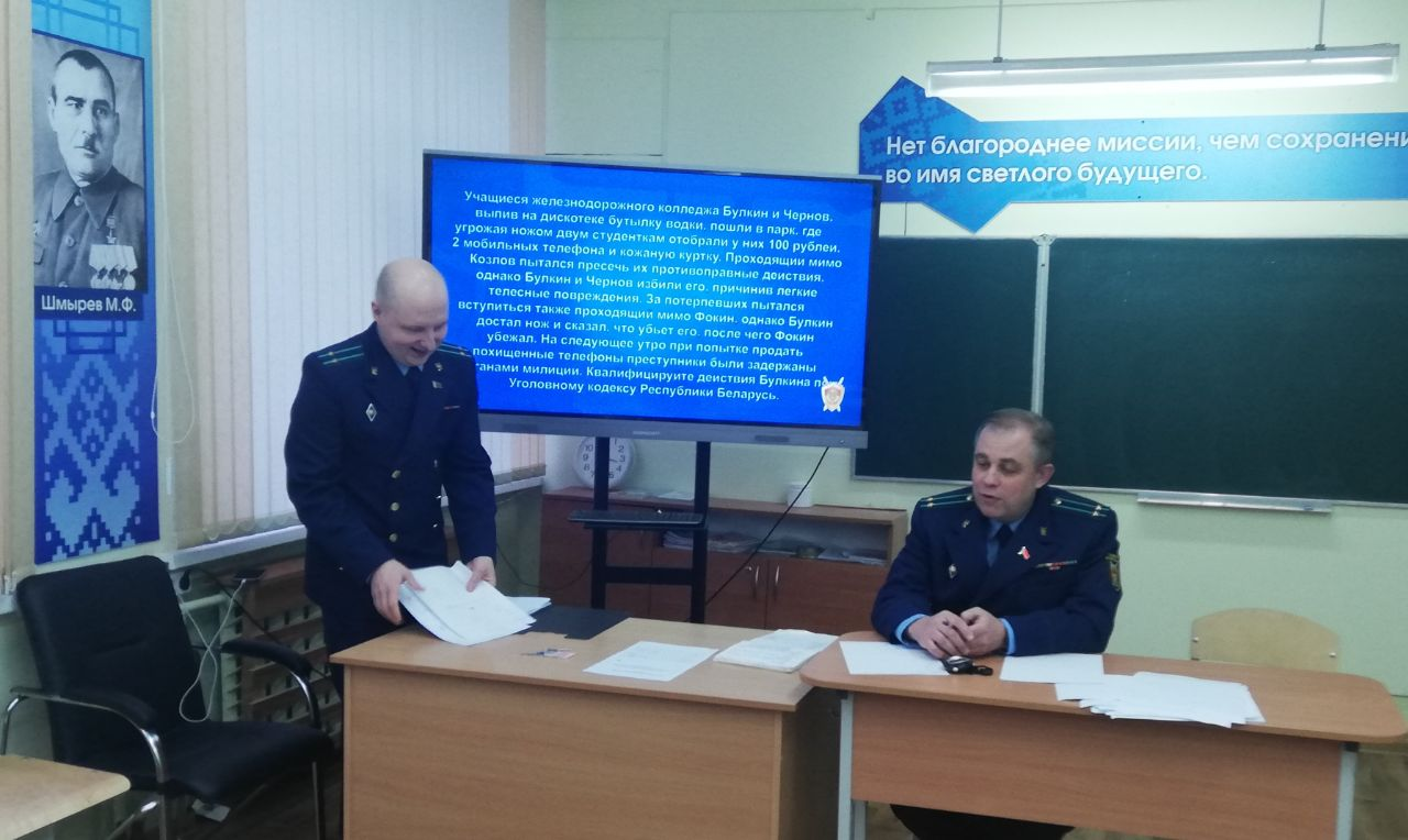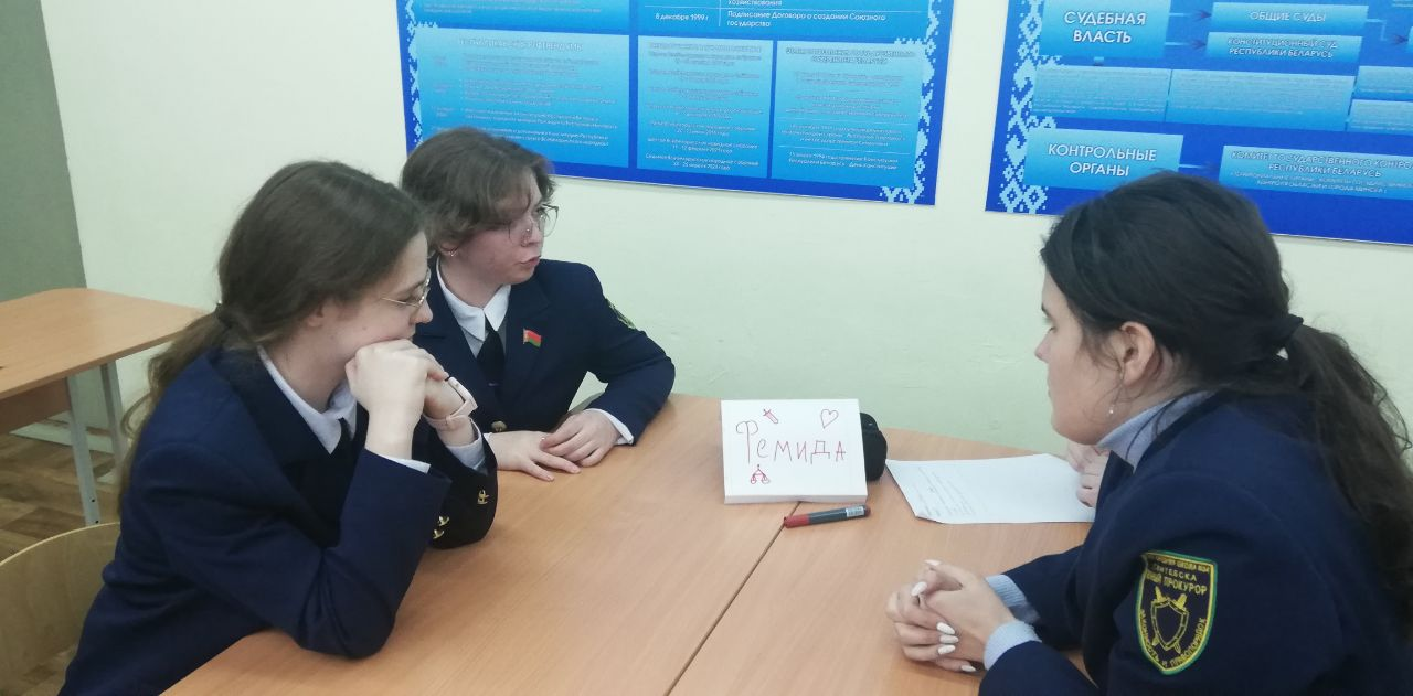 Сегодня в учреждении образования совместно с представителями областной прокуратуры прошла правовая игра «Знатоки права» среди учащихся профильных классов. В ходе игры все учащиеся проявляли свою активность. По результатам отборочного тура 1 место заняла команда «Фемида», состоящая из учащихся 11 «А» класса «Юный прокурор»: Шевченко Ангелины, Синициной Дины, Ратомской Александры, Савлукова Максима. Эти учащиеся   показали высокие знания в области права. Пожелаем учащимся профильного класса «Юный прокурор» успехов в выбранной профессии.