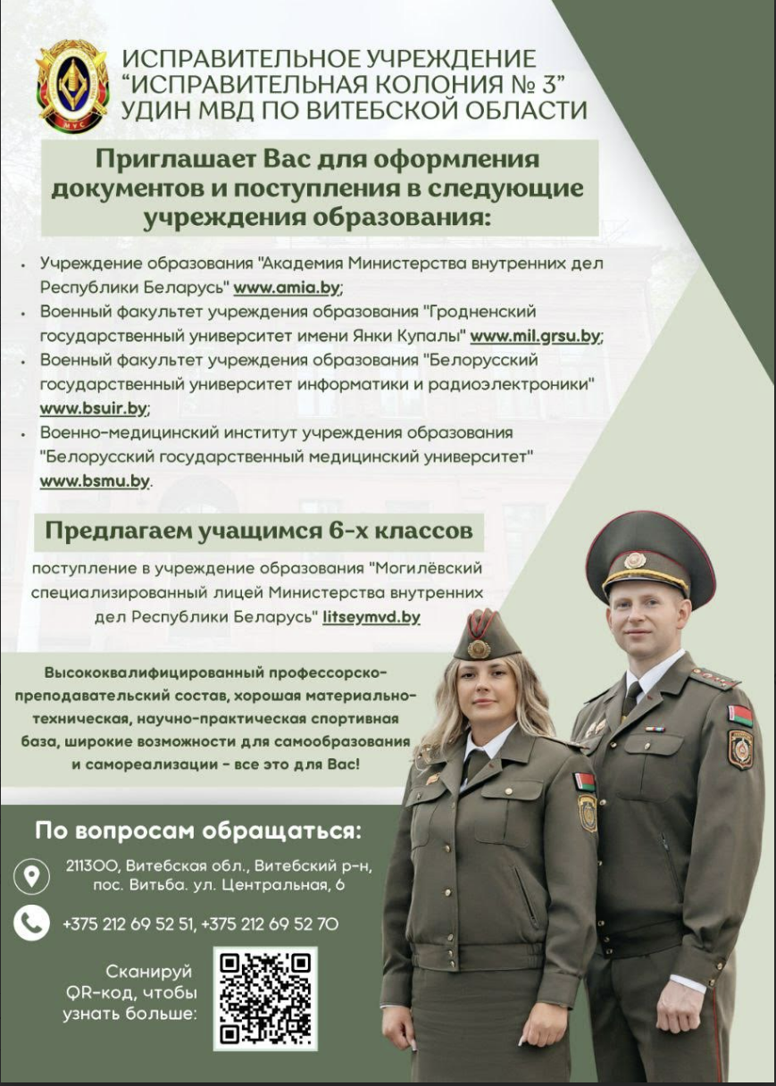 Если служба в Вооруженных Силах – твое призвание, мы ждем тебя по адресу: г. Витебск, ул. Ленинградская, д. 18, военный комиссариат Витебской области, контактные телефоны: (212) 60 73 65, (029) 302 07 22.